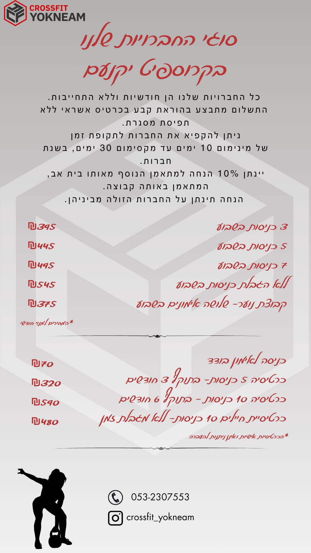 שעות פעילות ראשון עד חמישי: 06:00 עד 22:00 שישי: 07:00 עד 14:00 שבת: אימונים מיוחדים בהרשמה מראש